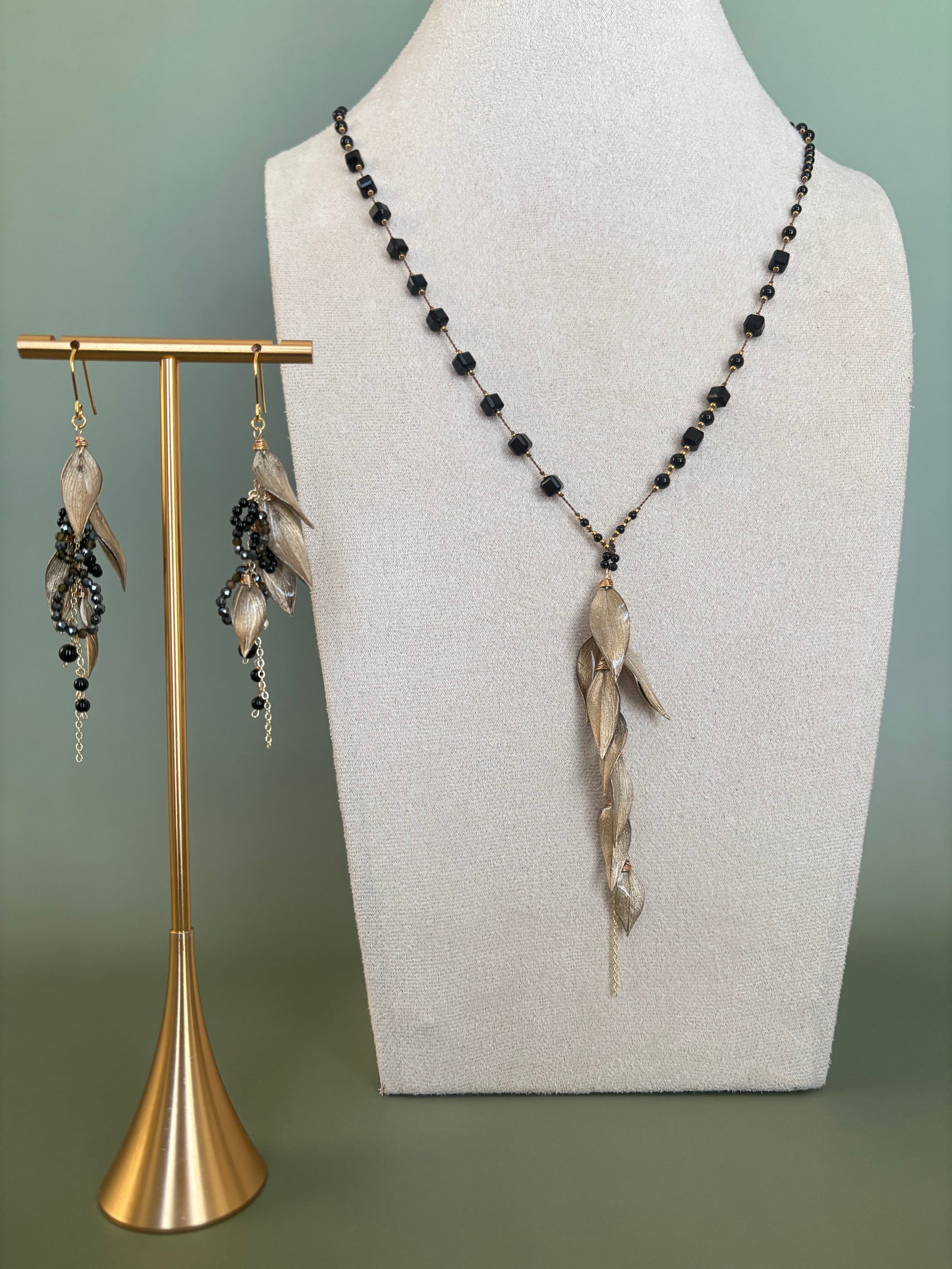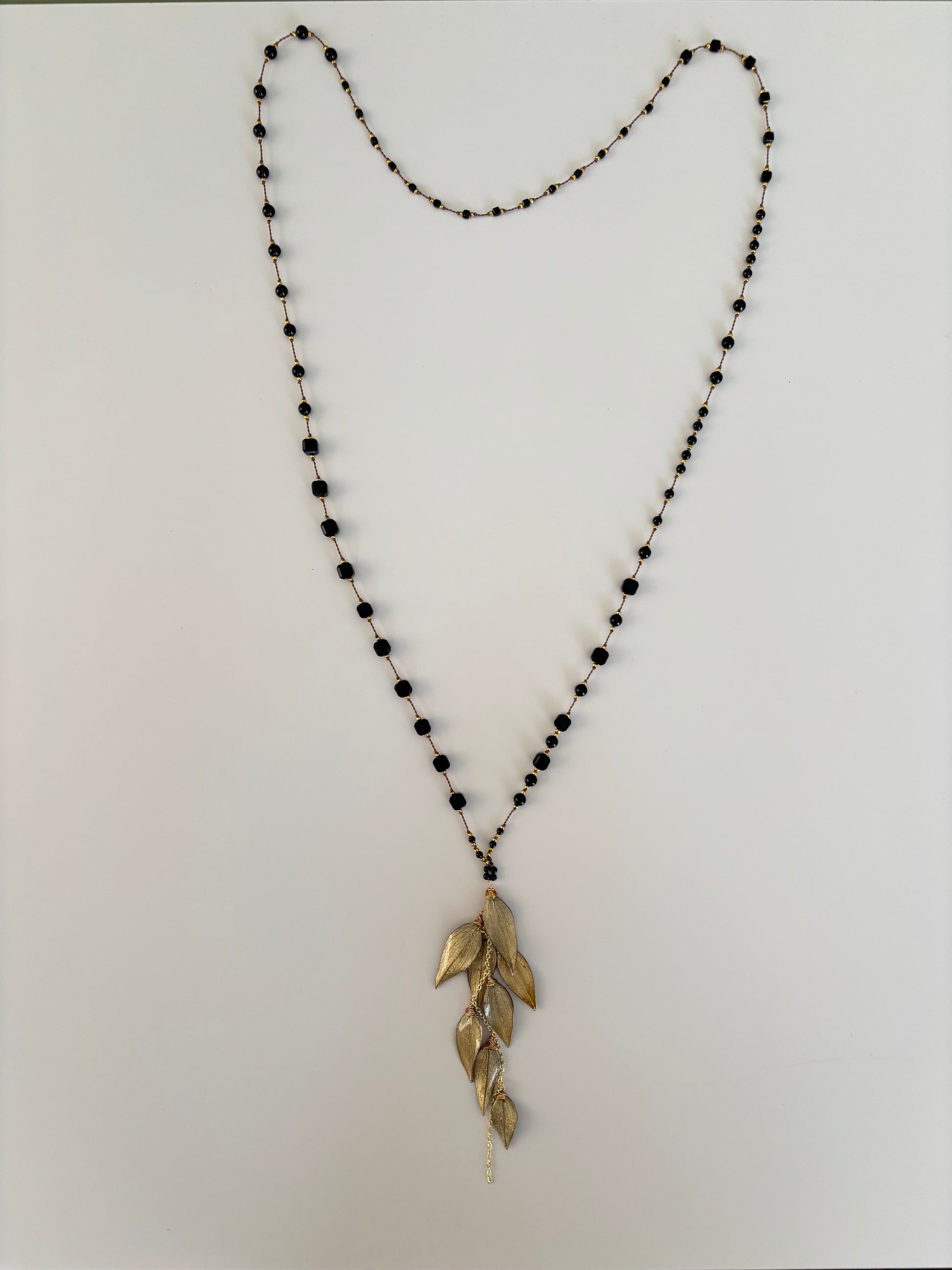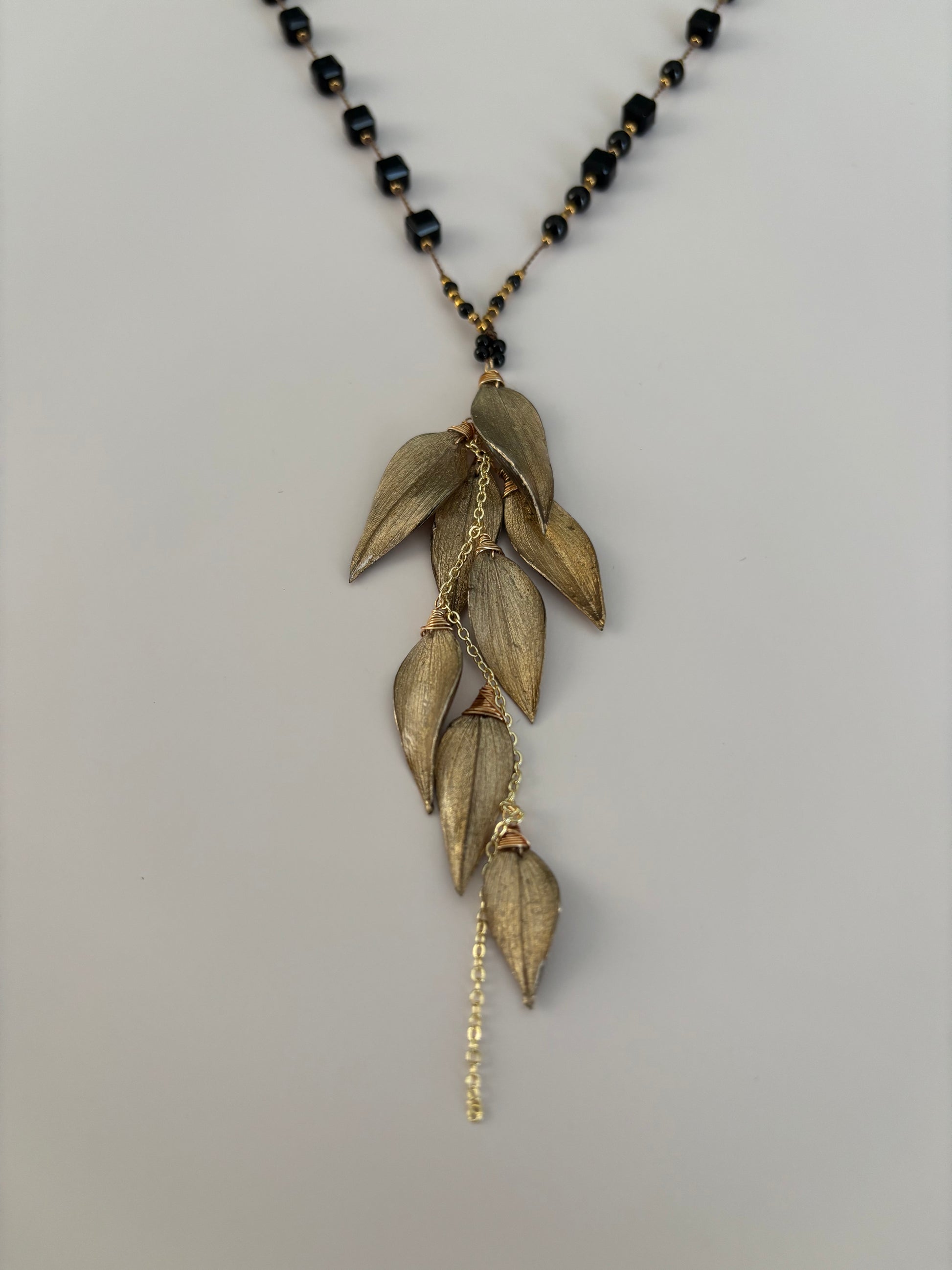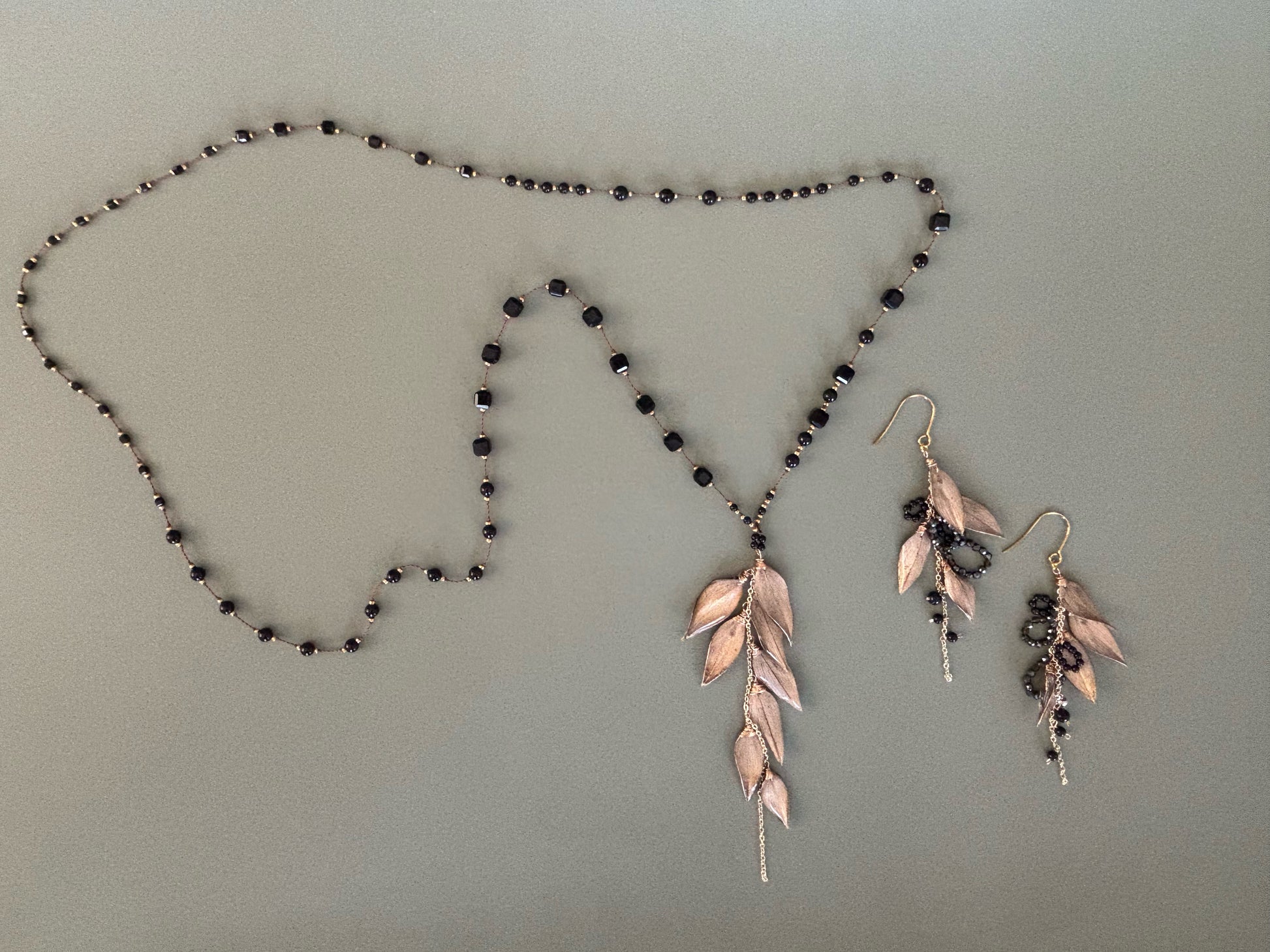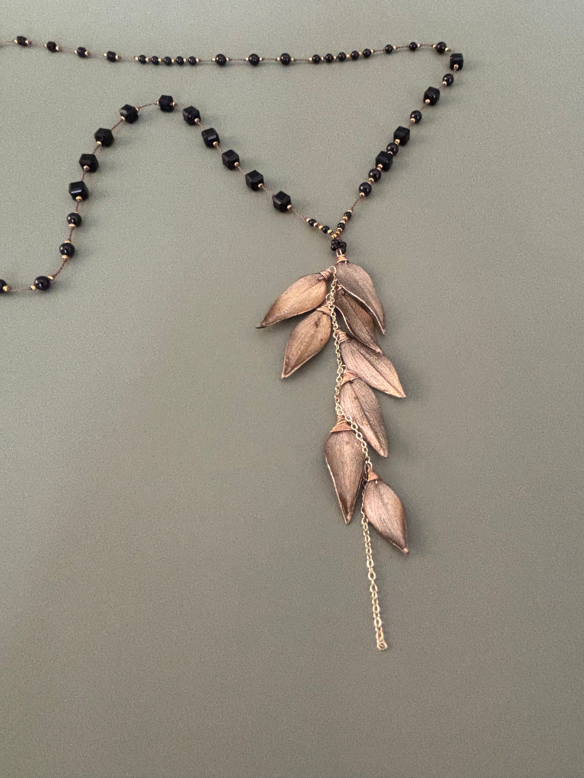 ラスカス(本物の植物)とブラックスピネルのロングネックレスです。